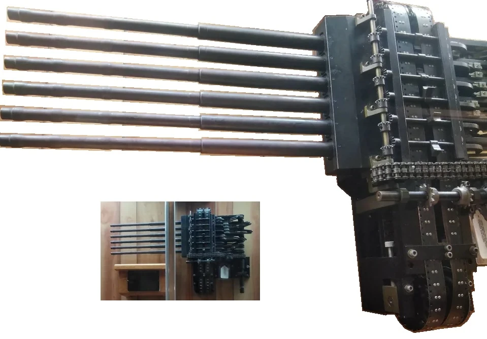 The AAI In-Line is an externally driven chain/crankshaft operated machine gun with six fixed barrels. The weapon uses an unusual belt feeding system with a synchronizer that every sixth round is to be chambered in each barrel. It is chambered in 7.62×51mm NATO.