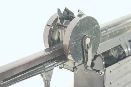 Ammunition is fed into the weapon from a looped loose metal belt with a capacity of 26 rounds, enclosed within a metal protective shell. A spring cocked by the bolt forwards the belt during recoil. Rounds are aligned with the chamber, fed into the chamber by the bolt, and fired by the firing pin. To prevent premature firing, an ejector is present between the bolt and the bottom of the cartridge, which is retracted 1.5 mm before the bolt closes.