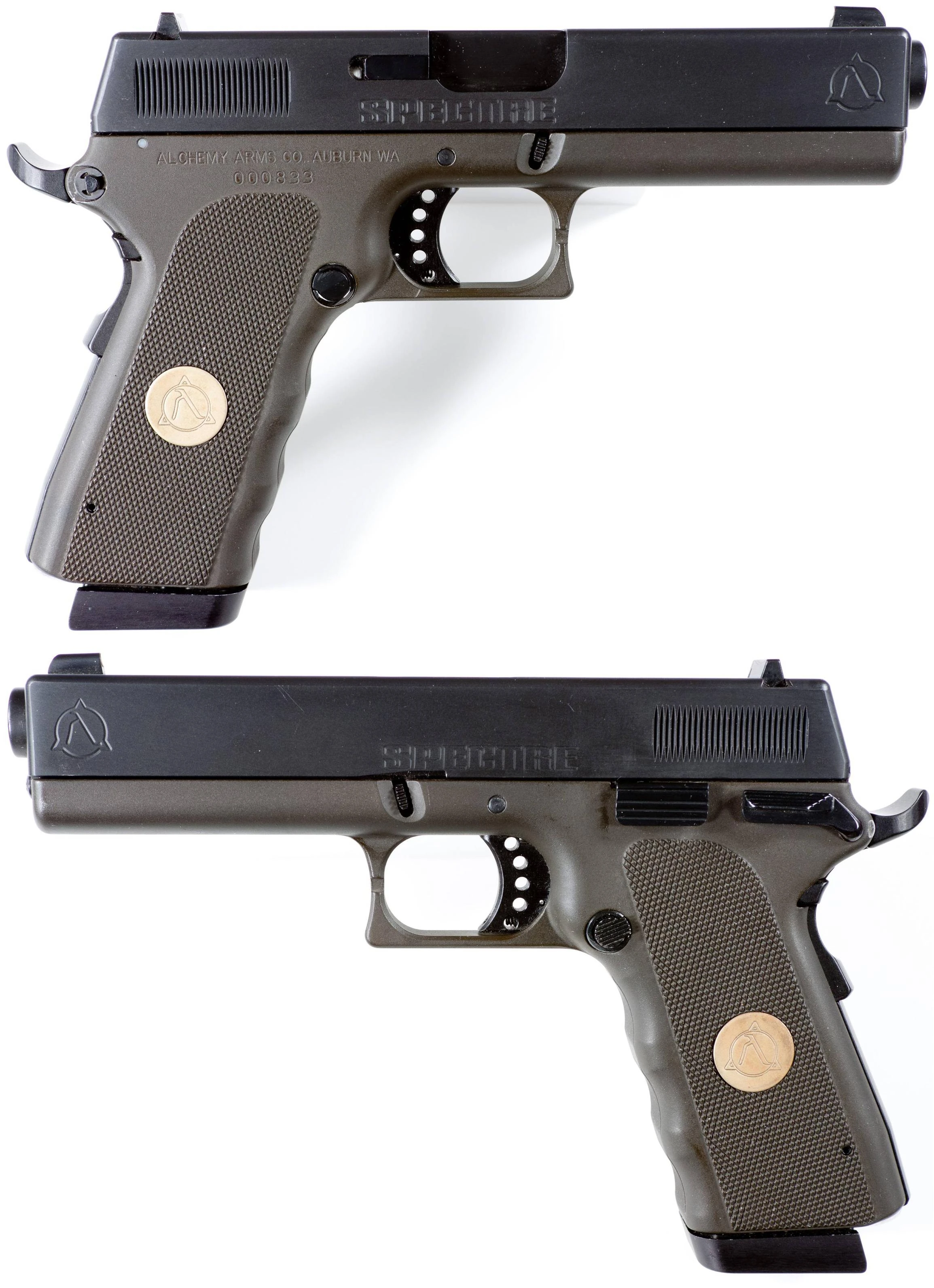 The Alchemy Arms Spectre is a semi-automatic pistol chambered in .45 ACP. The Spectre's function and aesthetics are influenced by two prominent and proven pistol designs - the M1911 and the Glock. It was produced in unknown quantities before its manufacturing company - Alchemy Arms, Co. - succumbed to financial pressures and was abandoned in 2006.