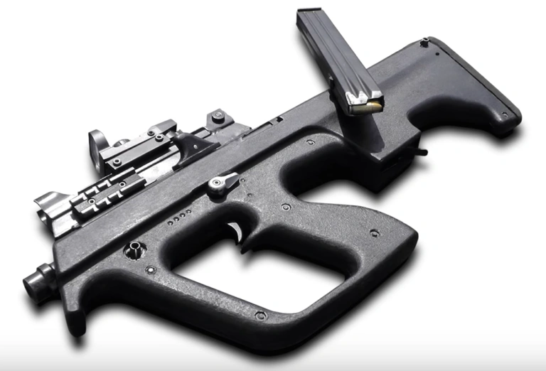 The Caribe is a hammer-fired bullpup submachine gun chambered in 9x19mm. It is select-fire and has a rate of fire of around 1,200 rpm. The weapon is sometimes shown with a threaded muzzle, and a suppressor for the weapon appears to be in development.[1]