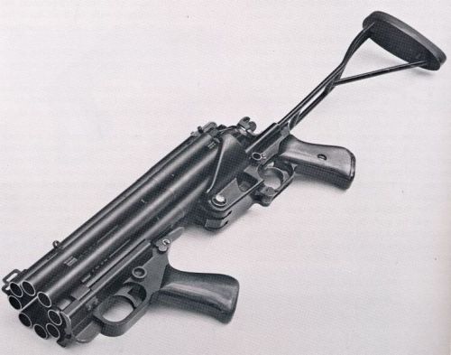 Had a tear gas grenade receptacle placed in the middle of the eight-barrel cluster. The tear gas grenade could be fired by pulling the front trigger.