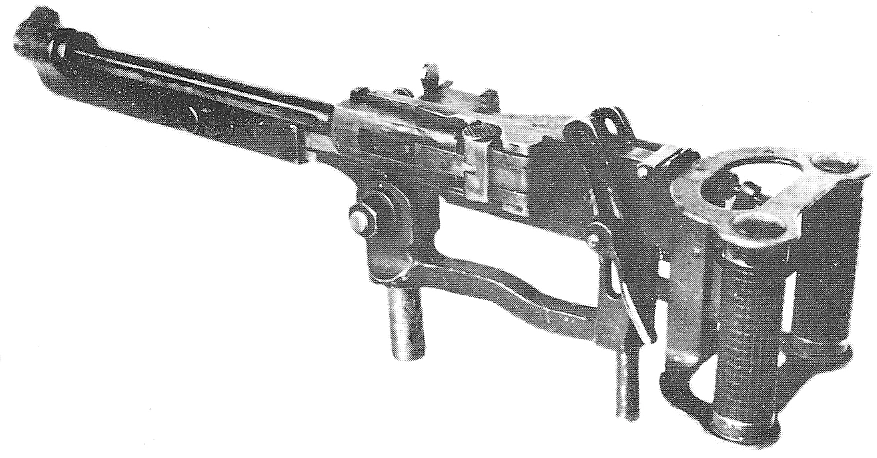 The gun was built with spade grips and fitted onto an adjustable mount, which had levers to control the elevation. It was offered with a variety of differing muzzle attachments and toggle locks, and a non-mounted variant with regular grips was also developed.