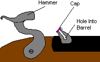 An animated diagram depicting the hammer in a caplock rifle hitting the percussion cap.