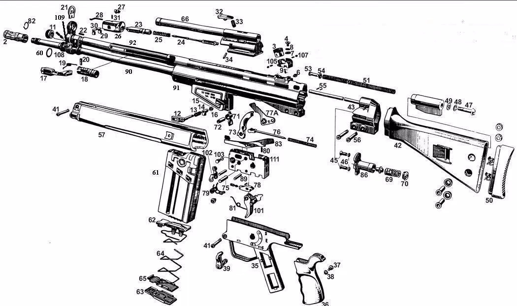 The G3 is built using as many stamped steel parts as possible. The receiver is stamped from sheet steel. The trigger unit housing along with pistol handle frame, also are stamped from steel and hinged to the receiver using the cross-pin in the front of the trigger unit, just behind the magazine housing.