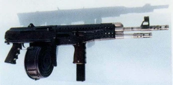 The ITM Model 3 is a combined assault rifle and submachine gun developed by IM Arms of Ohio for urban warfare. The top section is an AK derivative rifle with the lower section a submachine gun. the lower barrel was in 9×19mm fed from Uzi magazines, the upper one was in 7.62×39mm fed from AK magazines.