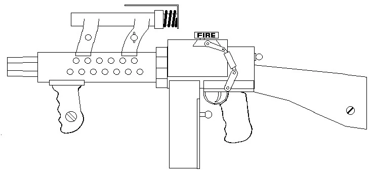 The Kerfoot multibarrel machine gun is a gas operated, 4 barreled machine gun. The barrel cluster is shrouded in an air cooled barrel jacket with a pistol grip portruding from underneath to handle recoil. The weapon comes with a fixed stock and an optical IR sight/carry handle.