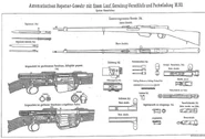 The Mannlicher M1893 is a semi automatic rifle chambered in the 8x50mm round. It uses a screw delayed blowback operation where the bolt has 70° angled locking lugs that have to overcome a quater twist that delays the action until the gas pressure drops to a safe level to eject. The bolt cocks the striker on opening (a la Mauser) and fires from a closed position. When firing the trigger pulls a lever connected to a sear to fire the weapon. The magazine is stripper fed and holds 5 rounds.