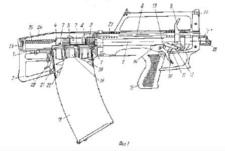 This weapon is in the bullpup configuration and features a 100-round triple stack box magazine. The weapon uses delayed blowback to reduce the rate of fire. The firing pin is said to play a part in the weapon's feed mechanism.