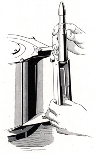 Loading started by rotating the coupling sleeve until the follower was right at the mouth of the magazine. The loader then pushed the follower up into the magazine to create enough room for one or at most two rounds. They then inserted the rounds one at a time, sliding them down into the feed lips from above. After one or two rounds were loaded, the procedure was repeated, pushing the cartridges up into the drum and loading more. Attempting to rush this procedure could result in rounds jumping off the spiral feed tracks: if this occurred, the magazine would have to be dismantled to remedy it. A hand-lever loading tool that clamped over the mouth of the magazine was often required to insert the last few rounds due to the weight of those already inside. The tensioning tool could be used to wind back the follower if loading was proving overly difficult, though this required care as if it was moved too far the rounds closest to it could tip over and fall off the feed tracks.